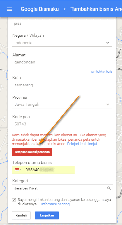 5. Kemudian anda akan memasuki halaman maps untuk menentukan lokasi bisnis anda